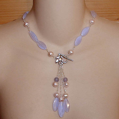 Chalcedony & Pink Grey Freshwater Pearl Drop Necklace, hand wired with Sterling Silver Wire and finished with a Sterling Silver Leaf Toggle Clasp.