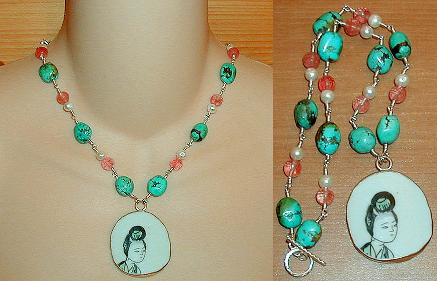 Ming Dynasty Pottery Shard with Faceted Cherry Quartz, Turquoise & Freshwater Pearls, hand wired with Sterling Silver Wire and finished with a Sterling Silver Toggle Clasp.